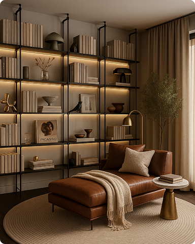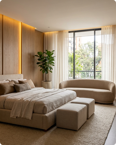 02. INTERIORISMO: Damos forma a atmósferas a través de materiales, iluminación, texturas y mobiliario, construyendo ambientes que transmiten carácter, armonía y bienestar.